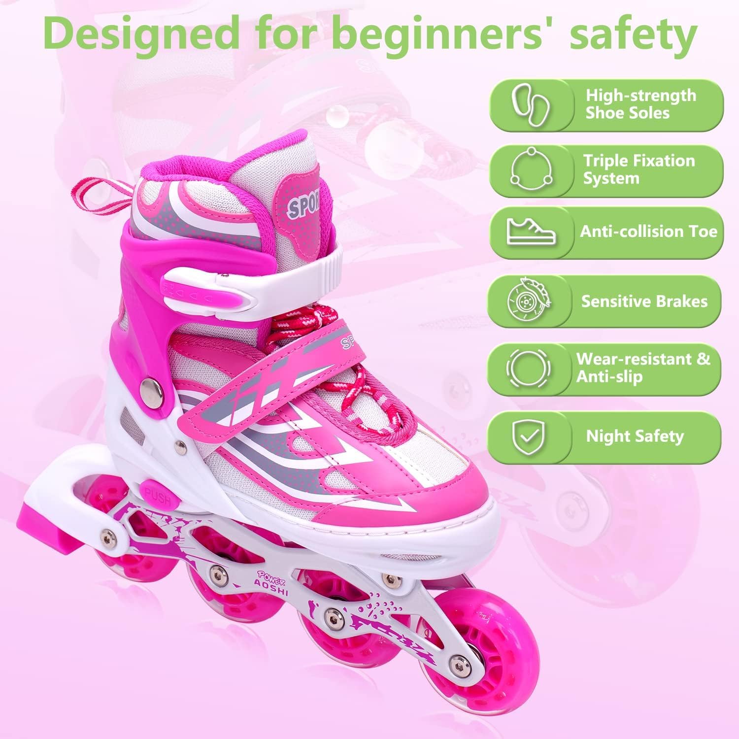【 ADJUSTABLE INLINE SKATING 】 : Adjustable inline skates can be adjusted to different sizes by pushing a button as kid's feet growing to ensure years of fun. 4 sizes (6/7/8/9) are available for your choice, please check size chart in the product image and choose the proper size.
